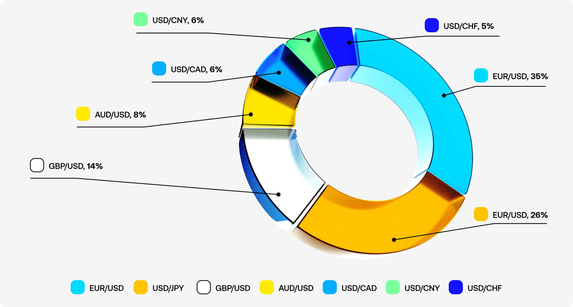 66% daripada perdagangan forex global terbahagi kepada tujuh pasangan mata wang utama, termasuk EUR/USD, USD/JPY, GBP/USD, AUD/USD, USD/CAD, CNY/USD dan USD/CHF.