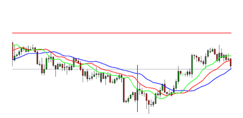 - Gigi (garisan merah) adalah Purata Bergerak 8-tempoh, yang dipindahkan 5 bar ke hadapan.