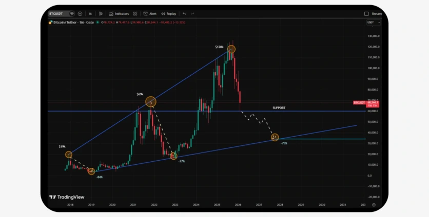 Jika Bitcoin mengikuti preseden sejarah pembetulan 70–80%, harga secara teorinya boleh merosot ke arah rentang $34,000. Walau bagaimanapun, struktur pasaran telah berkembang, dan penyusutan sedalam itu kini merupakan unjuran dan bukannya kepastian.
