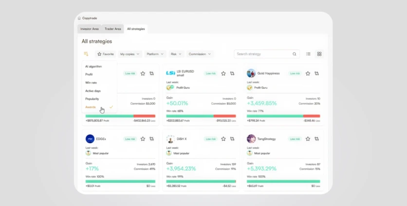 Anda boleh menyusun strategi copytrade yang tersedia mengikut Anugerah untuk mengetengahkan pelaku terbaik dengan serta-merta. Hanya memerlukan satu klik, tetapi secara signifikan mempermudahkan pencarian anda untuk strategi yang sempurna.